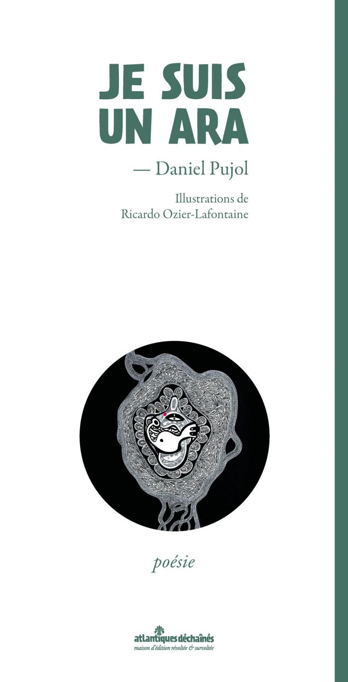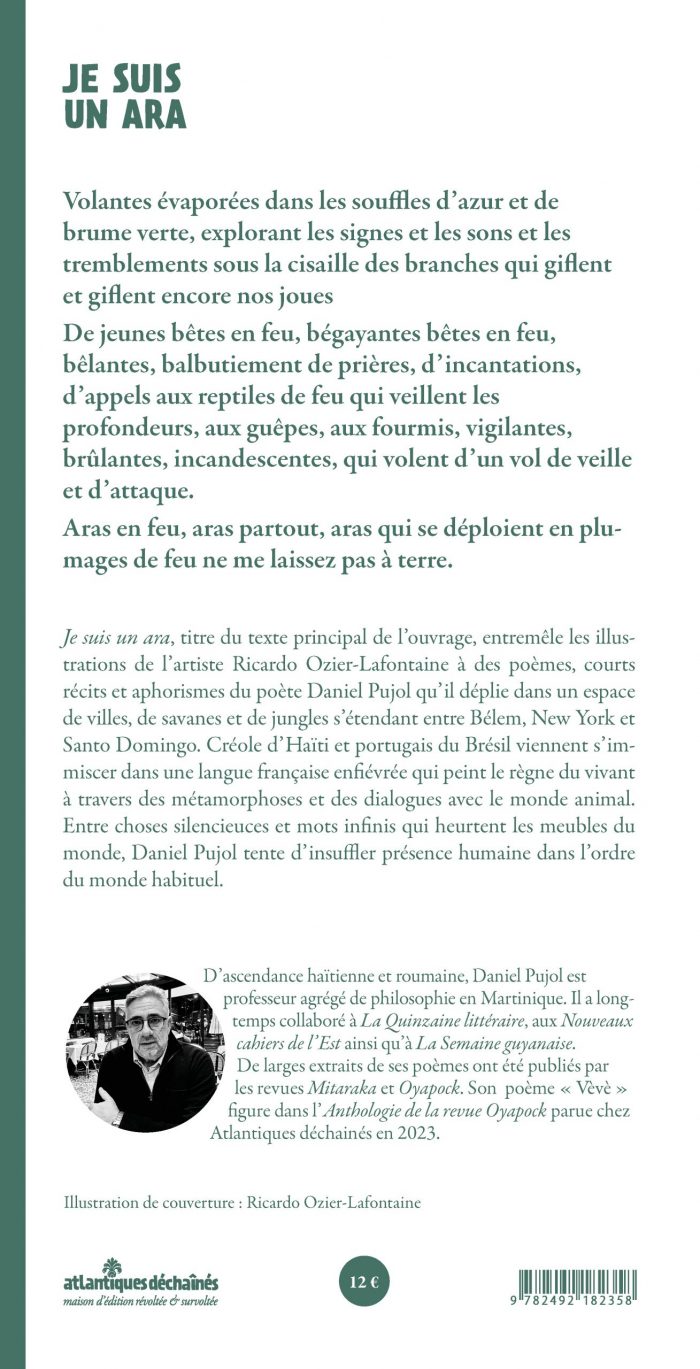 Je suis un ara, titre du texte principal de l’ouvrage, entremêle les illustrations de l’artiste Ricardo Ozier-Lafontaine à des poèmes, courts récits et aphorismes du poète Daniel Pujol qu’il déplie dans un espace de villes, de savanes et de jungles s’étendant entre Bélem, New York et Santo Domingo. Créole d’Haïti et portugais du Brésil viennent s’immiscer dans une langue française enfiévrée qui peint le règne du vivant à travers des métamorphoses et des dialogues avec le monde animal. Entre choses silencieuces et mots infinis qui heurtent les meubles du monde, Daniel Pujol tente d’insuffler présence humaine dans l’ordre du monde habituel, implorant les aras qui se déploient en plumages de feu de ne pas le laisser à terre.