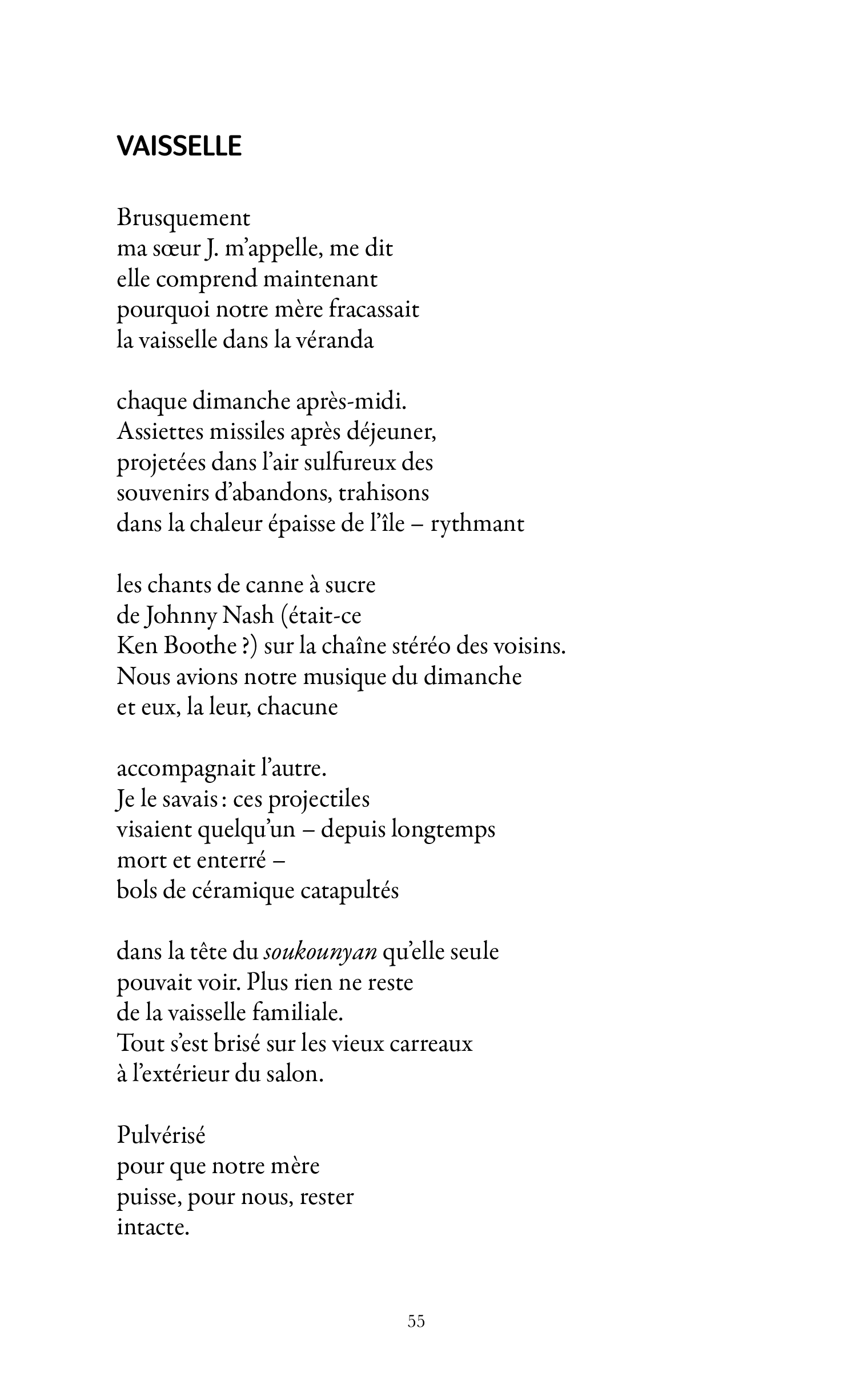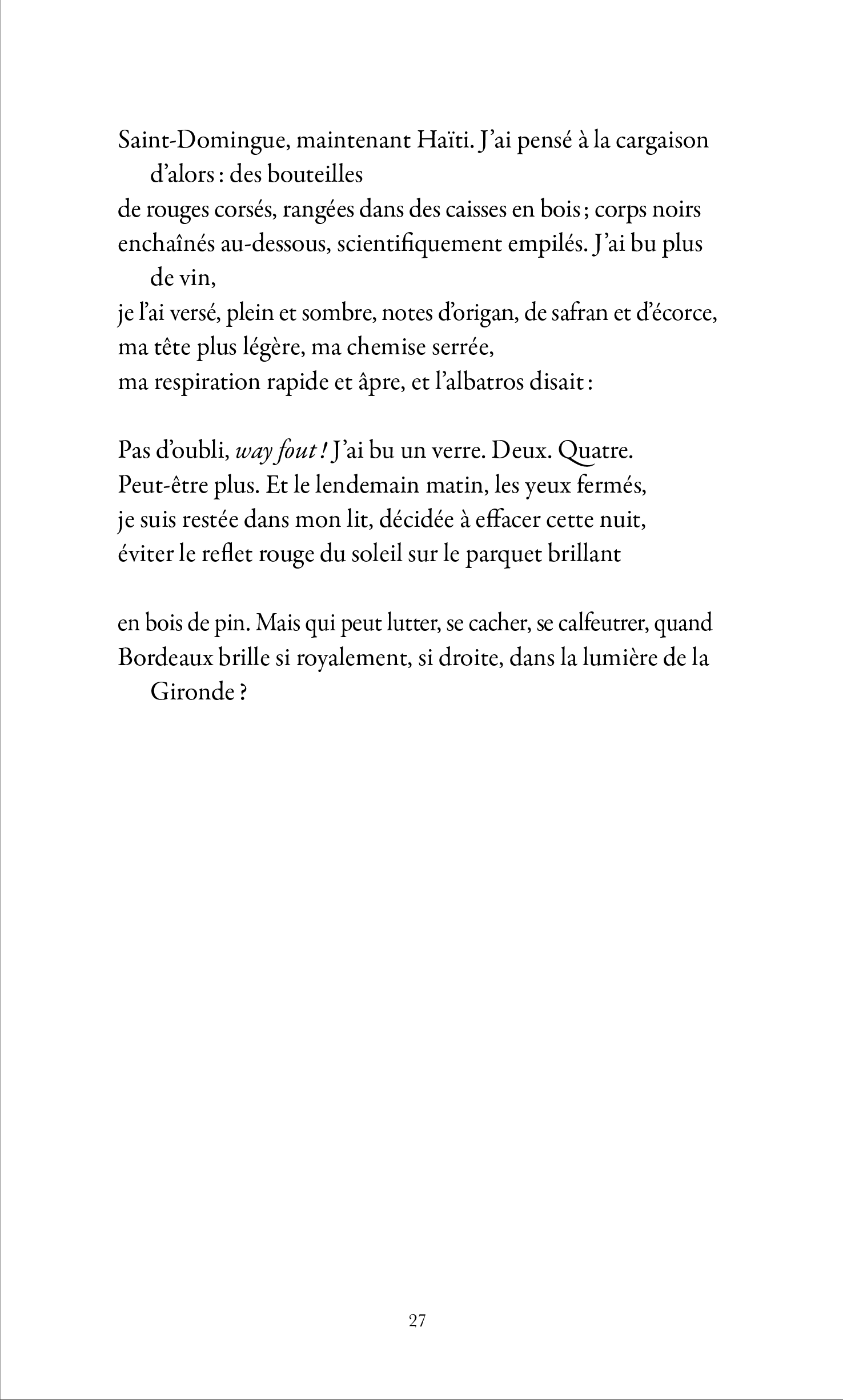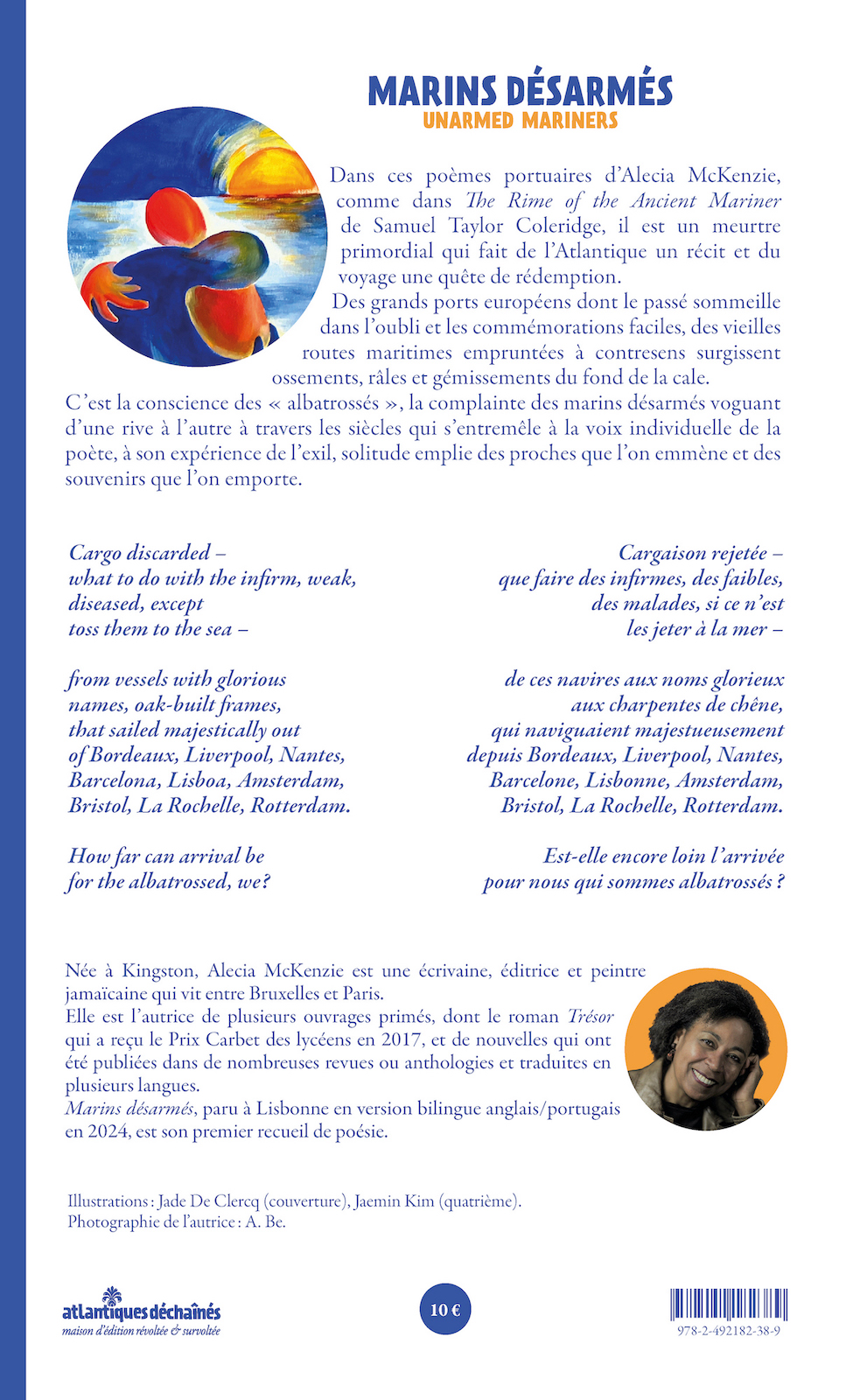 Dans ces poèmes portuaires d’Alecia McKenzie, comme dans The Rime of the Ancient Mariner de Samuel Taylor Coleridge, il est un meurtre primordial qui fait de l’Atlantique un récit et du voyage une quête de rédemption. Des grands ports européens dont le passé sommeille dans l’oubli et les commémorations faciles, des vieilles routes maritimes empruntées à contresens surgissent ossements, râles et gémissements du fond de la cale. C’est la conscience des « albatrossés », la complainte des marins désarmés voguant d’une rive à l’autre à travers les siècles qui s’entremêle à la voix individuelle de la poète, à son expérience de l’exil, solitude emplie des proches que l’on emmène et des souvenirs que l’on emporte. Le livre est proposé dans un format bilingue qui permet de découvrir la prosodie originale de la version anglaise.