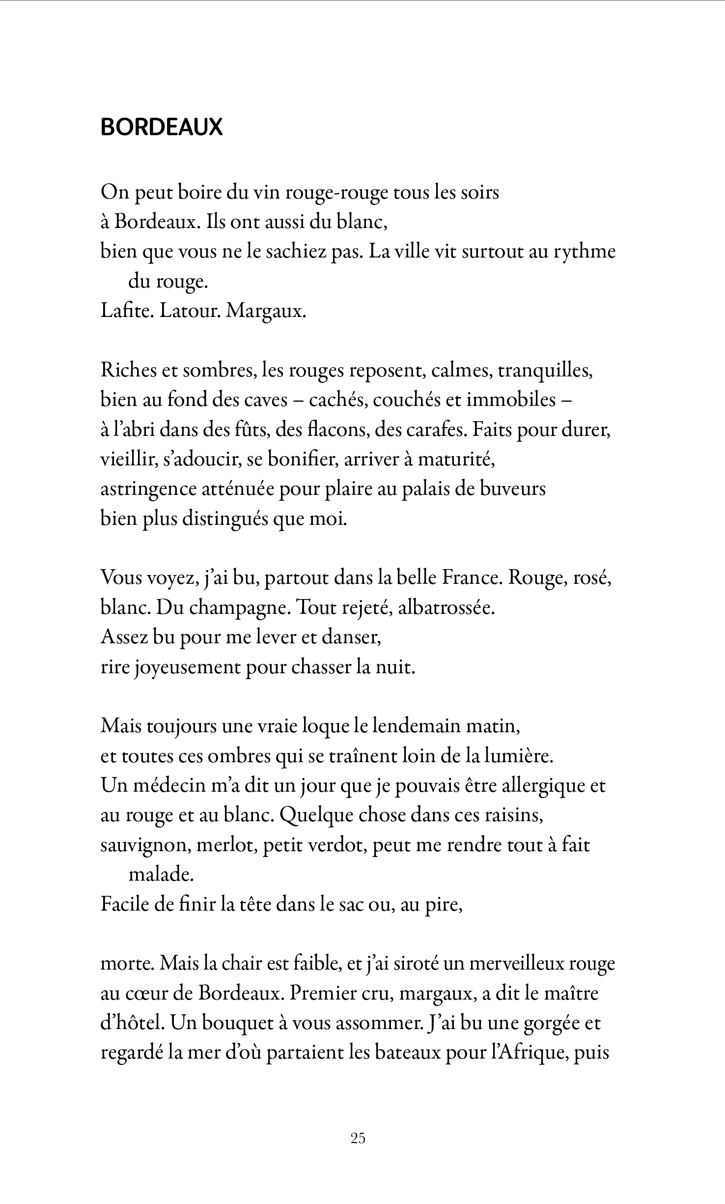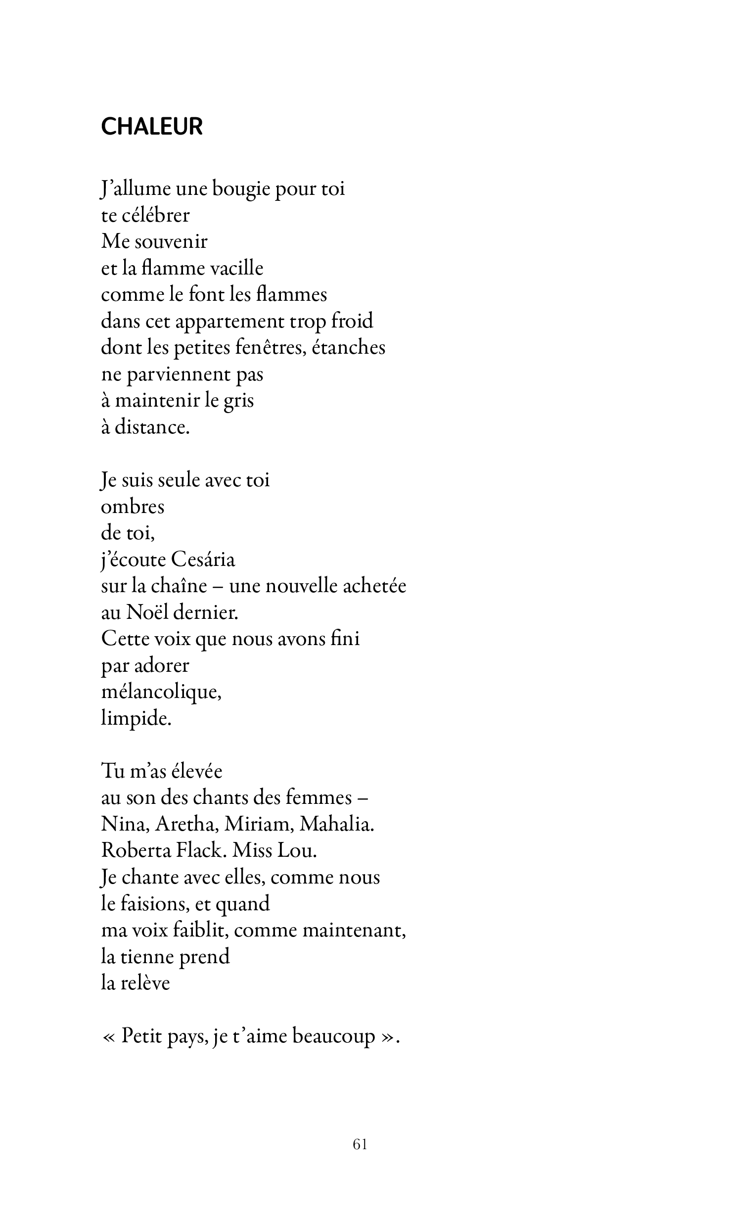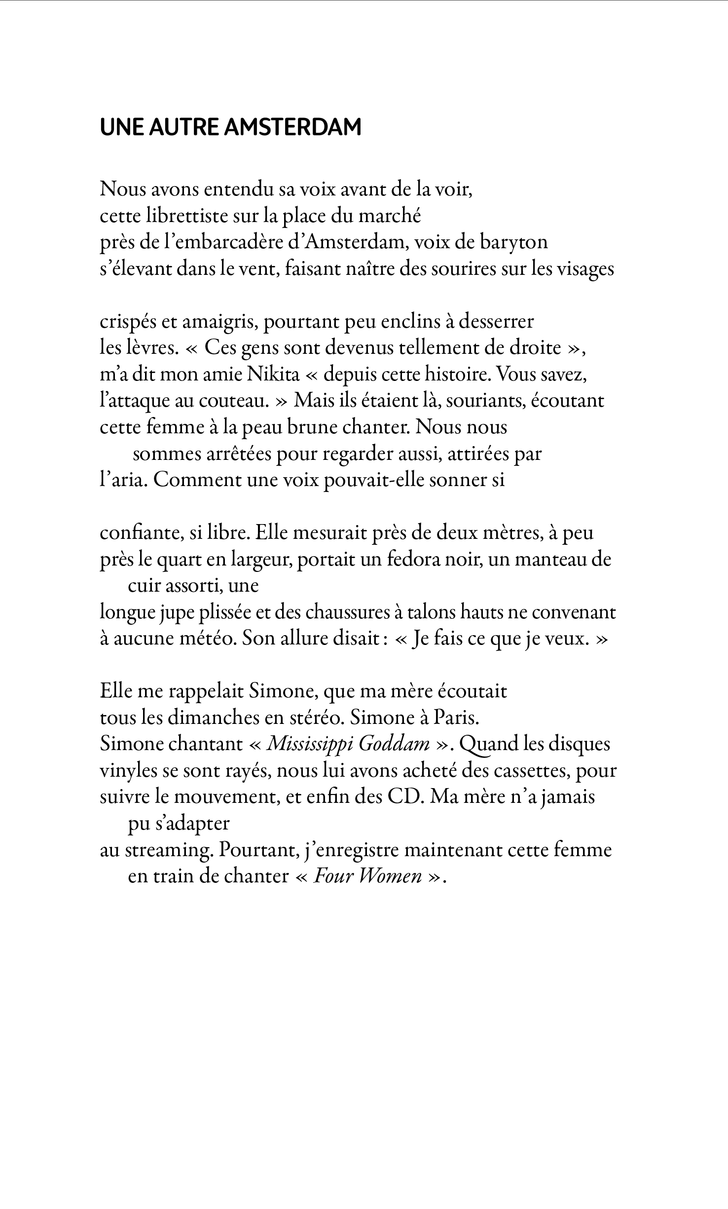 Dans ces poèmes portuaires d’Alecia McKenzie, comme dans The Rime of the Ancient Mariner de Samuel Taylor Coleridge, il est un meurtre primordial qui fait de l’Atlantique un récit et du voyage une quête de rédemption. Des grands ports européens dont le passé sommeille dans l’oubli et les commémorations faciles, des vieilles routes maritimes empruntées à contresens surgissent ossements, râles et gémissements du fond de la cale. C’est la conscience des « albatrossés », la complainte des marins désarmés voguant d’une rive à l’autre à travers les siècles qui s’entremêle à la voix individuelle de la poète, à son expérience de l’exil, solitude emplie des proches que l’on emmène et des souvenirs que l’on emporte. Le livre est proposé dans un format bilingue qui permet de découvrir la prosodie originale de la version anglaise.